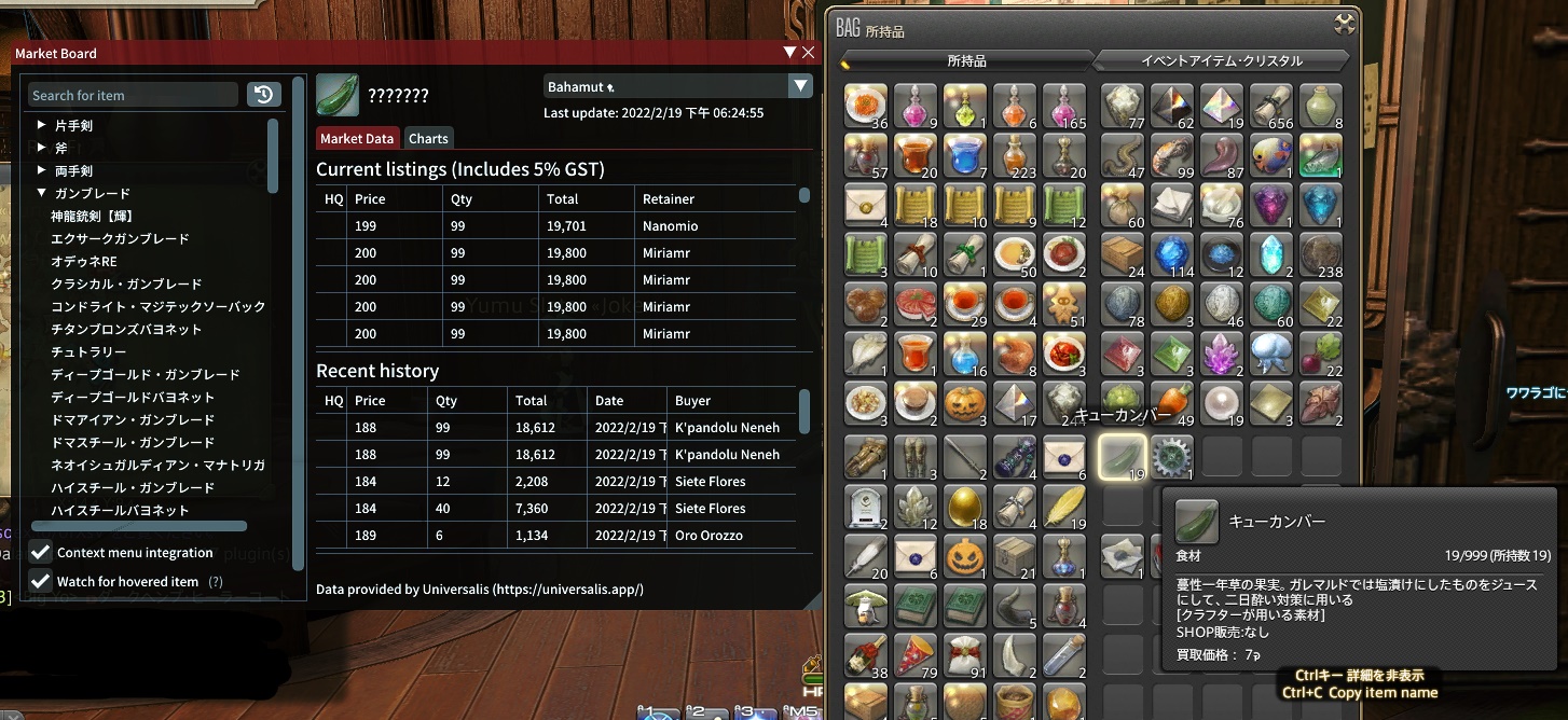 查詢物品價格,但需要玩家有打開板子更新價格,準確度取決於伺服器使用Dalamud的人數